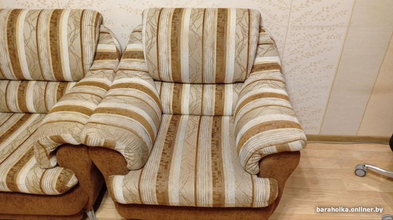 Отдам. Подлокотники кресла затерты/чуть грязные. Подушки-сидения дивана немного проваливаются. Внутри в каркасе раскладного механизма под матрасом одна из деревянных балок треснута.