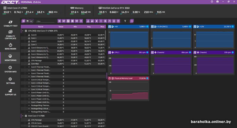 Теперь по результатам 10минутного OCCT теста в экстремальном режиме с процессорным кулером Thermalright Macho Rev.A температура на ядрах не поднималась выше 65С.