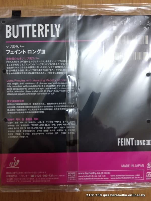 Продам накладку Butterfly Feint Long III, цвет black, толщина губки 1.3мм (длинные шипы). Накладка новая, запечатанная в упаковке, цена 85 рублей или обменяю на накладку TIBHAR GRASS D.TECS, цвет black, OX, тоже новую. По всем вопросам обращайтесь в личку.