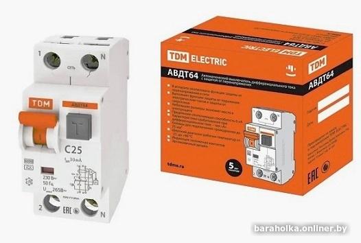 Автомат дифференциальный TDM АВДТ 64 1P+N C25. Ток номинальный 25А, ток утечки 30мА, напряжение 220-230В. Новый, в упаковке. 30 р. 8 033 9012793