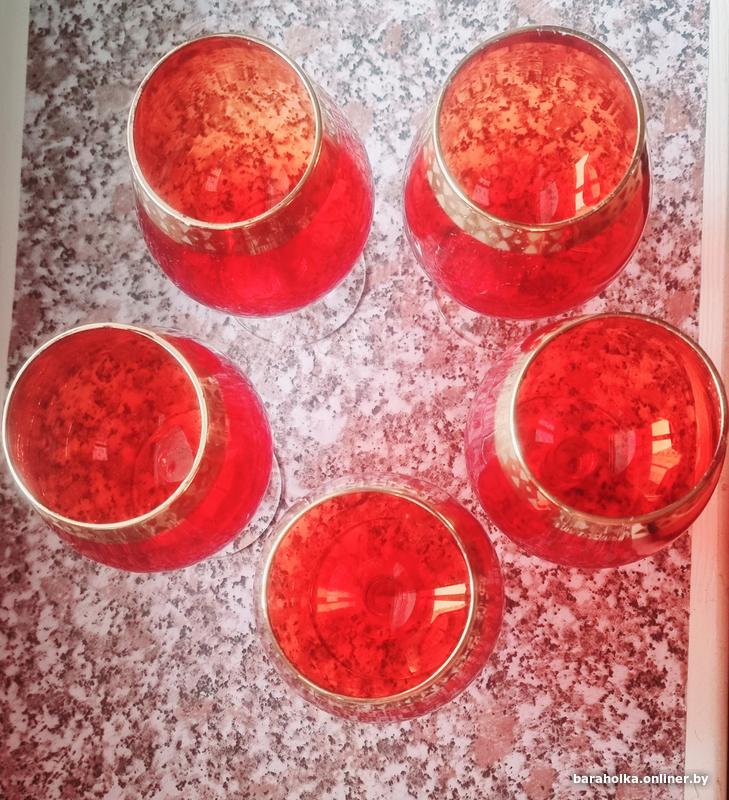 Хрустальные бокалы красные с золотом 5шт,новые, высота 14,5см, 350мл, поют отлично громко. 50р./шт