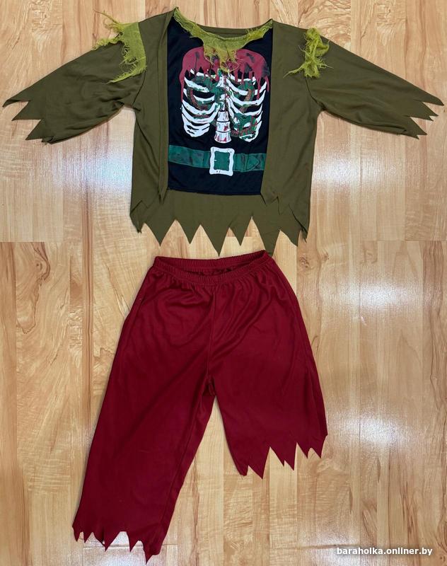 Флисовый зеленый пиджак с заплатками, рваные штаны. Головной убор подбирается дополнительно. Маркирован на 7-9 лет, 122-134см, можно плюс-минус.