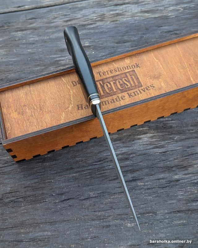 На рукояти объёмная больстерная композиция из нейзильбера и карбона, основная часть-черный граб под датским маслом. Длина 125мм. Темлячное отверстие.