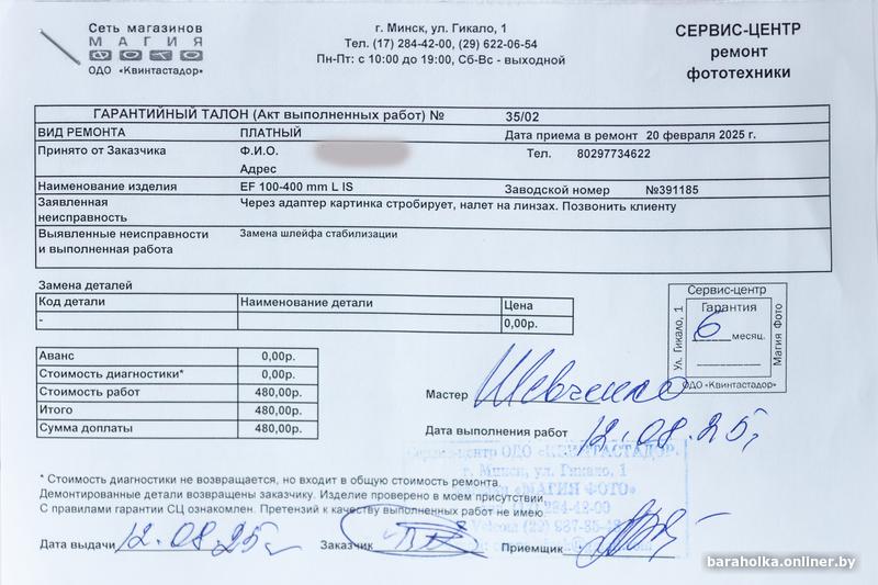 По работе никаких нюансов нет, линзы чистые (с момента покупки поставил фильтр, продаю без него), без пыли, внешних повреждений никаких нет, не падал, под дождём никогда не был, всё работает хорошо. Резкая картинка на открытой апертуре во всём диапазоне фокусных. Кольцо фиксатора положения зума в полном порядке, ничего не люфтит и не болтается, ход зума плавный и в меру плотный. На бленде имеются небольшие царапины (фото прилагается). Прошёл предпродажную диагностику в СЦ с заменой внутреннего шлейфа стабилизатора, фото талона прилагается.