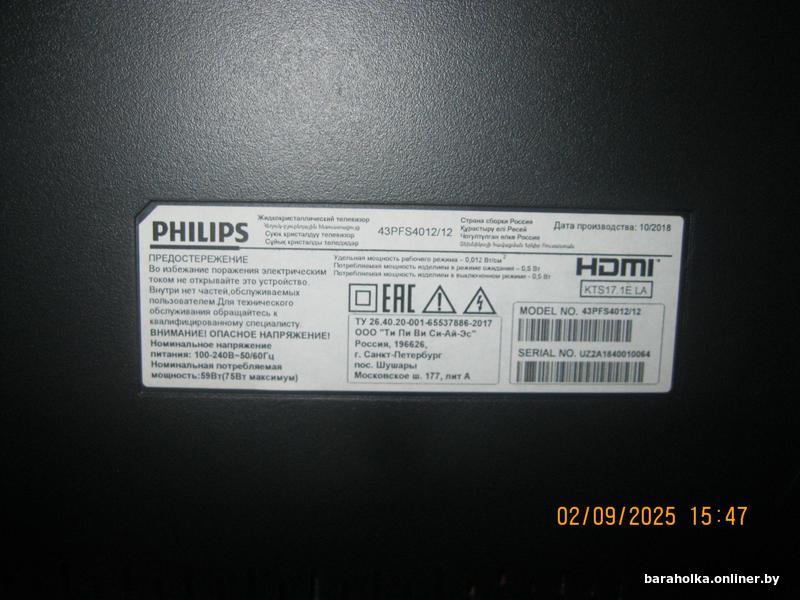 Телевизор Philips 43PFS4012/12 целиком на запчасти с битой матрицей но вкл/выкл рабочий на фото вкл.в сеть продается без пульта . Детали снимать и разбирать самостоятельно ничего не буду , только при пакупке вынесу к вашему транспорту .Абсолютно без торга ,стоимость окончательная.Почтами и доставками не отправляю ,только приезжайте забирайте в будние дни г.Минск ул.П.Панченко !!!!!
