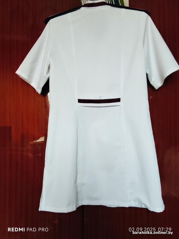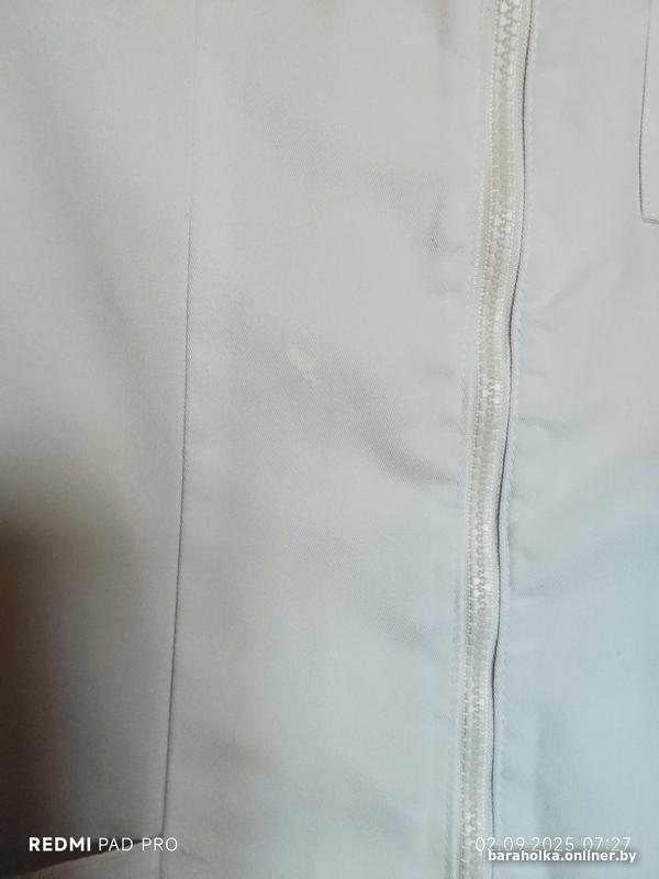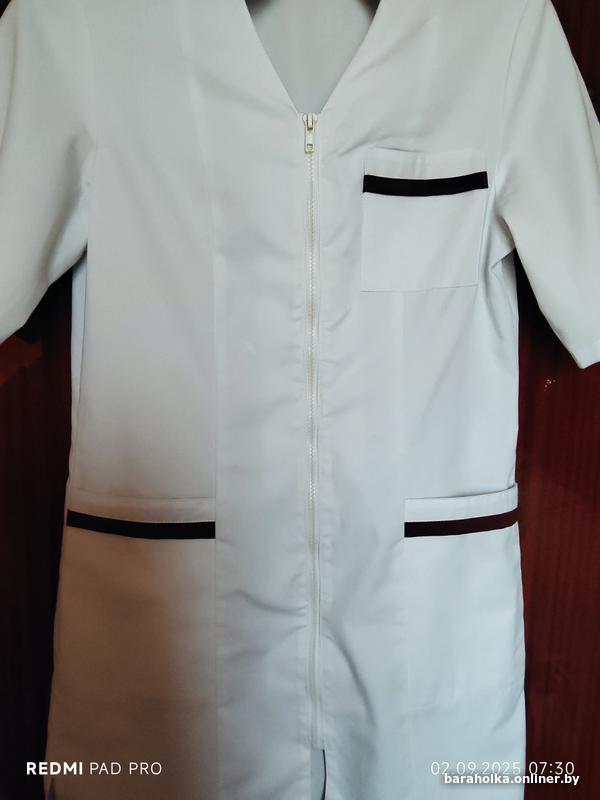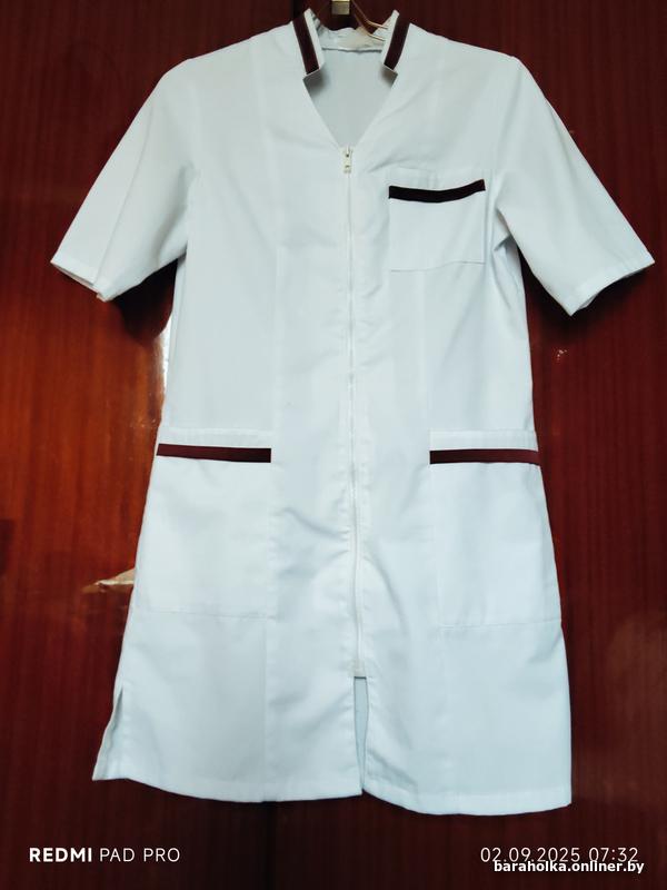 Медицинский халат из плотной ткани. Размер 44, длина халата 86 см. На фото показан дефект - пятно от белого лака для ногтей (работала в салоне красоты).