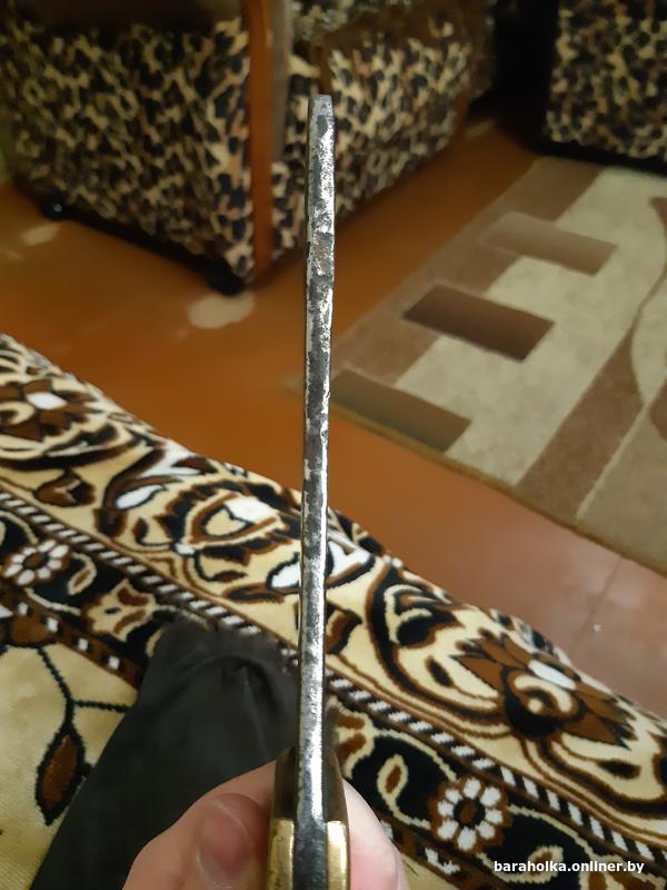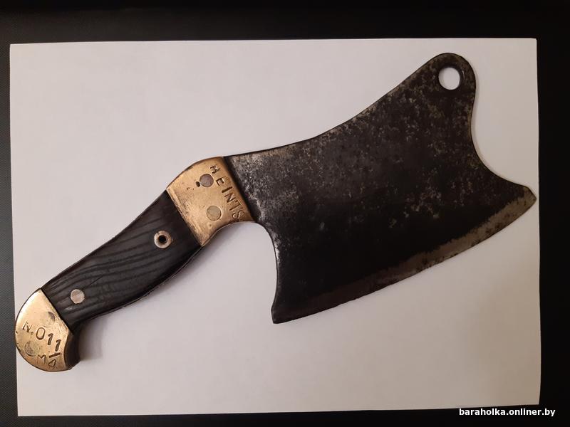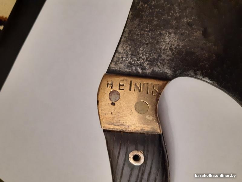 Продаю тесак (топорик) времён Первой Мировой Войны. Немецкий, в хорошем состоянии. Работа топорная, но выполнена крепко, ничего не люфтит и не болтается. Рукоять из твёрдых пород дерева, заклёпки медные. Накладки латунные, заклёпки также латунные. Общая длина 29 см, длина лезвия 16 см, ширина лезвия 10 см. Имеется отверстие для подвешивания. Также на накладках имеется множество различных клейм. "HEINTS" - возможно имя или фамилия владельца, а возможно название завода-изготовителя. Могу выслать почтой в пределах Республики Беларусь. Без торга.