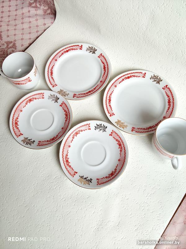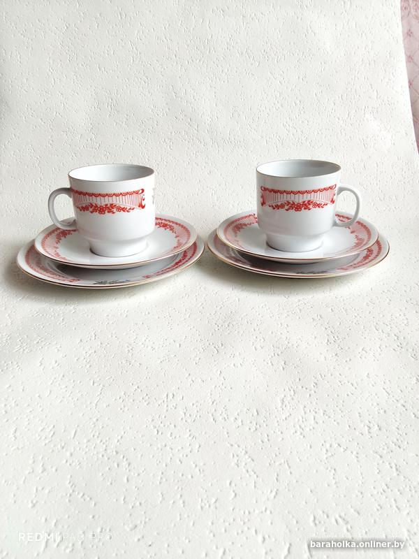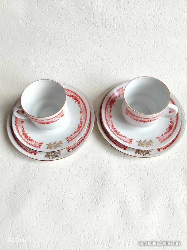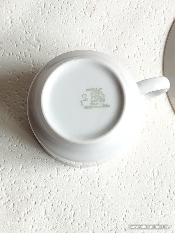 Чехословакия , Богемия, клеймо на каждом изделии. Высота чашки 7 см, объем 150 мл, диаметр блюдца 15 см, диаметр тарелочки для десерта 17 см.