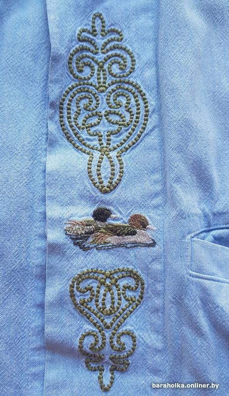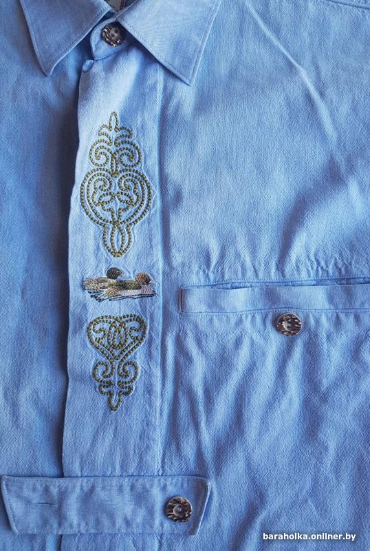 Это традиционная альпийская рубашка (Trachtenhemd) из коллекции фольклорной одежды, предназначенная для ношения на фестивалях, таких как Октоберфест, или в составе национального костюма в стиле баварском или тирольском. Она выполнена в светло-голубом цвете из хлопковой ткани, с асимметричной застёжкой, карманом на груди, декоративными пуговицами (возможно, из рога или имитации) и вышивкой в виде орнаментов и пары уток (ducks embroidery), что типично для альпийских мотивов ;