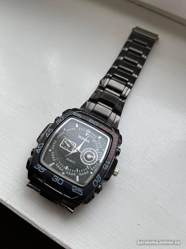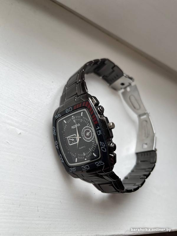 Продаются часы кварцевые, на батарейке, фирмы Rosra. В отличном состоянии стильные, черные. Боковые кнопки - муляж. Функционирует только заводная головка для выставления времени. Остальные кнопки - простые заглушки. Браслет регулируется удалением звеньев