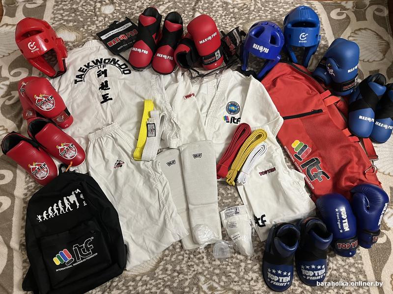 Остался весь необходимый аккредитованный набор для единоборств, тхэквондо: одежда (добок кимоно с поясами), перчатки (защита на руки), футы (защита на ноги стопы), шлем (защита головы), капа (защита зубов), бандаж (защита паха), а также есть сумка и рюкзак для амуниции.