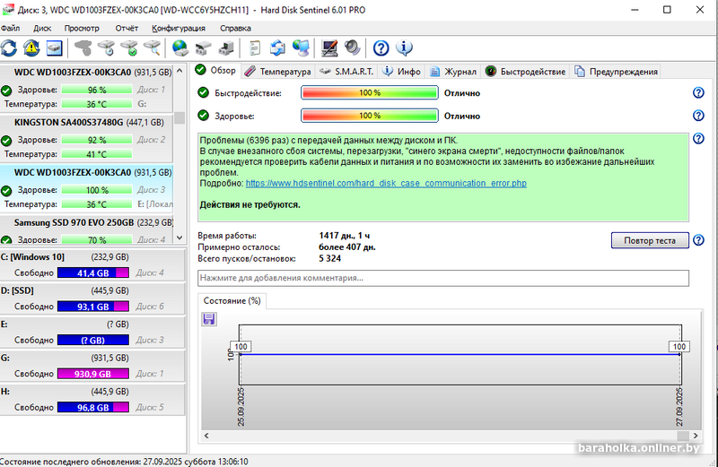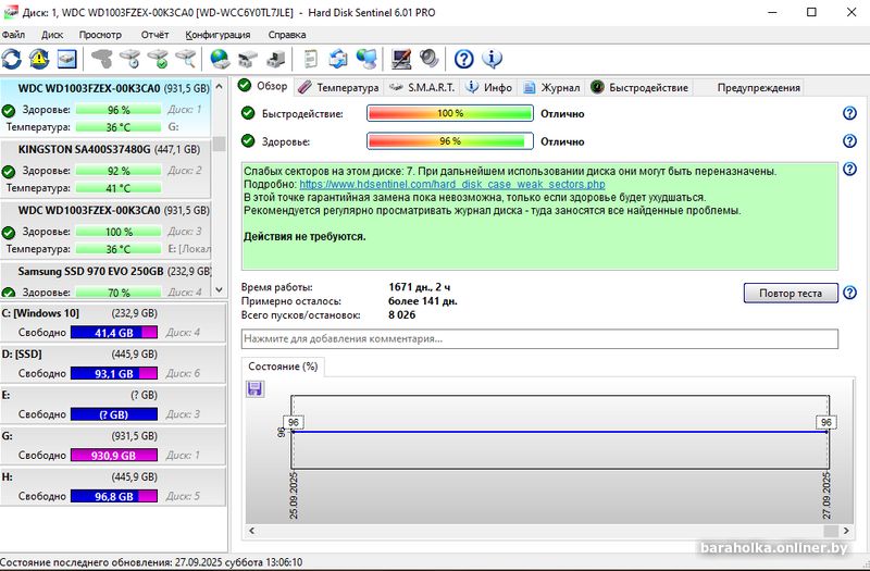 В рабочем состоянии, использовались для игр, хранения данных на компе долгое время, нареканий нет, у одного 1671 день наработки, у второго 1417, по тесту чтения не одного проблемного сектора, другие не делал.