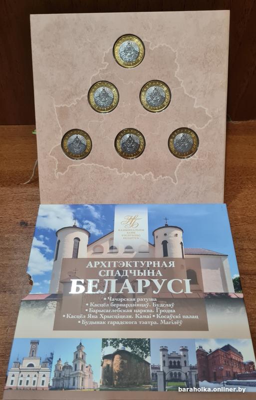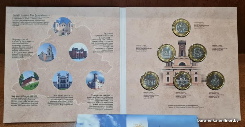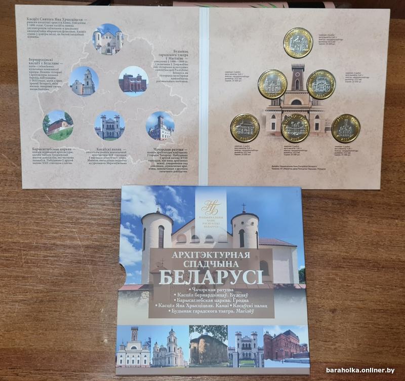 Комплект памятных монет серии "Архітэктурная спадчына Беларусі" в блистерной упаковке, состоящий из 6 монет, и включающий в себя по 1 монете каждого наименования в составе: "Чачэрская ратуша", "Касцёл бернардзінцаў. Будслаў", "Барысаглебская царква. Гродна", "Касцёл Яна Хрысціцеля. Камаі", "Косаўскі палац", "Будынак гарадскога тэатра. Магілёў"