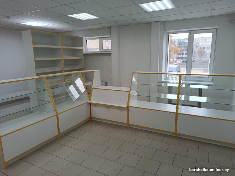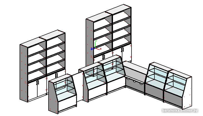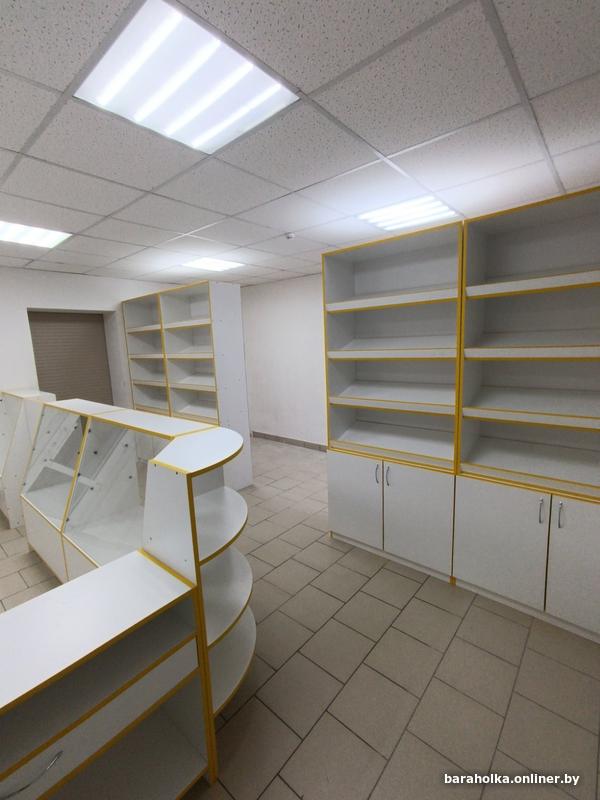 Двери в стеллажах по низу, кассовый ящик на замке.