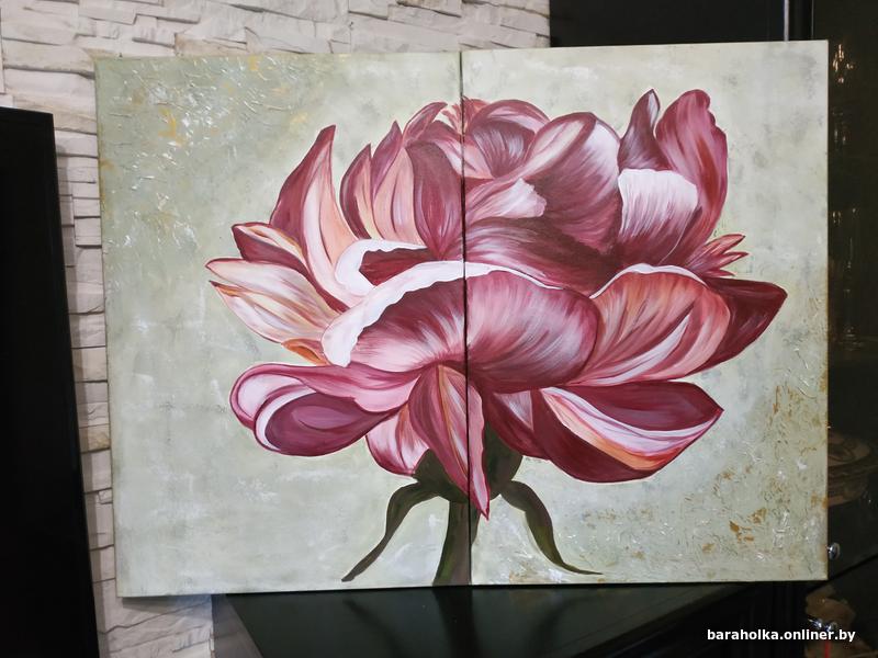 Картина "Бархатный пион" диптих, холст хлопок 100% на деревянном подрамнике, выполнена художественными акриловыми красками, размер 60х80х2см. Новая. Для покупателей, не проживающих в Минске, пересылка через "Белпочту" наложенным платежом. Торг уместен.