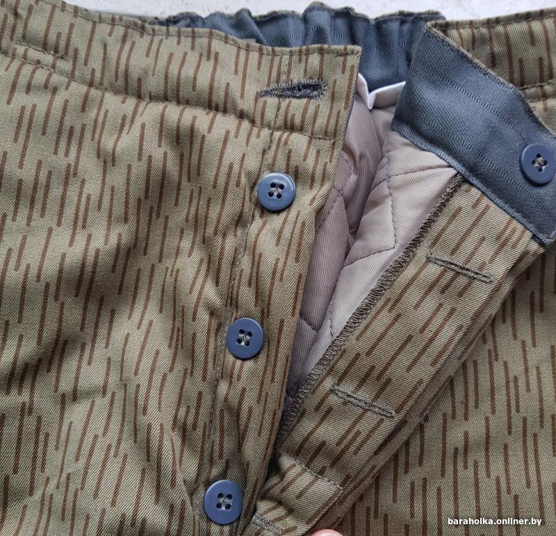 сделаны из смеси хлопка (65%) и полиэстера (35%), с карманами на бедрах, кнопками на синем пластике, D-кольцами для подтяжек и эластичным поясом. Это не летний вариант, а именно утепленный (FDA Strichtarn Camo Trousers Pants Winter);