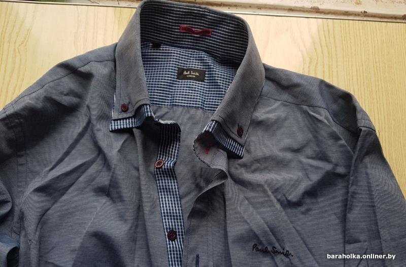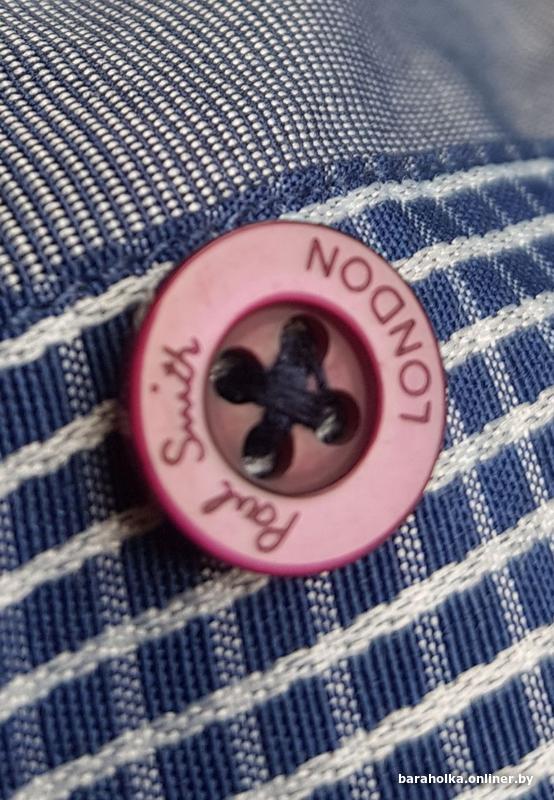 серая в тонкую полоску, контрастный клетчатый воротник и манжеты в сине-белом, розовые кнопки с надписью "Paul Smith London", эмбродированный логотип на груди, тег "Make Love not War" внутри, этикетки с уходом на нескольких языках;