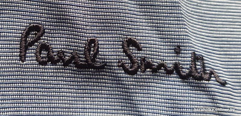 Кнопки — mother-of-pearl (перламутровые, с гравировкой "Paul Smith London", розовые — фирменный акцент). Эмбродированный логотип на груди четкий, без ошибок.