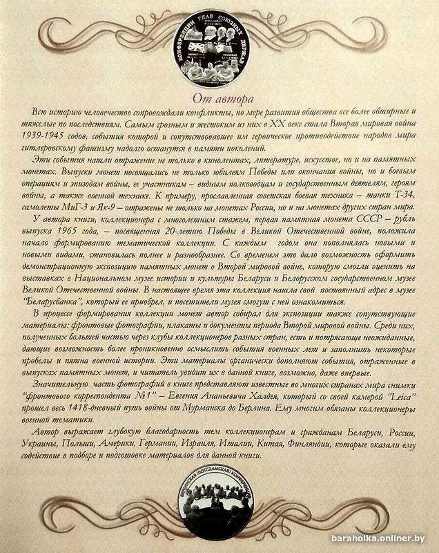 Автор Книги, Известный Белорусский Коллекционер - Нумизмат, представляет Массив Коллекционных Монет, посвященных Событиям и Эпизодам Второй Мировой Войны (1939 - 1945), Лидерам, Военачальникам и Героям стран Участниц, а также Использовавшейся в Войне Боевой Техники.