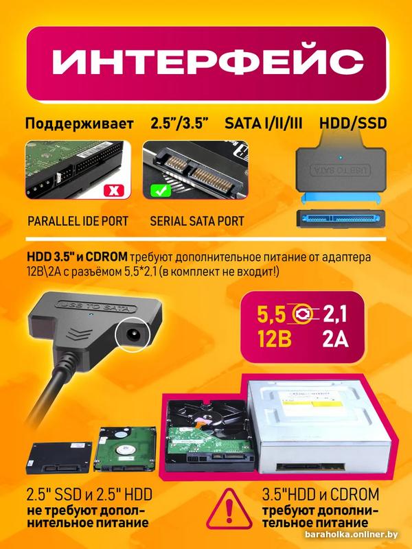 Кабель адаптер USB 3.0 - SATA III 2.5"/3.5" предназначен для подключения через порт USB3.0 дополнительного диска HDD или SSD, 2,5 или 3,5 дюйма стандарта SATA III. Питание 5В для работы диска берется из порта USB- При использовании HDD или SSD 3,5 дюйма есть возможность подключения внешнего блока питания 12и/2А Максимальная скорость передачи данных SATA III до 5 Гбит в сек- Полностью совместим с предыдущими версиями SATA II (до 3 Гбит в сек) и SATA I (до 1.5 Гбит в сек)