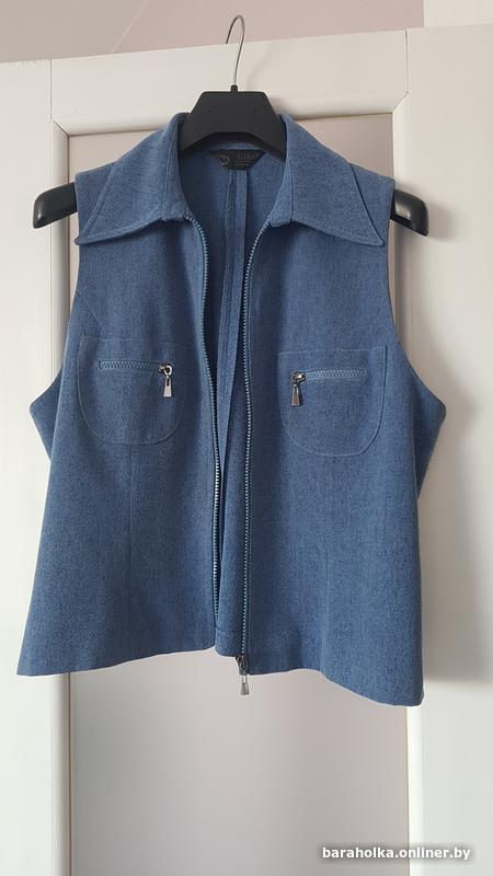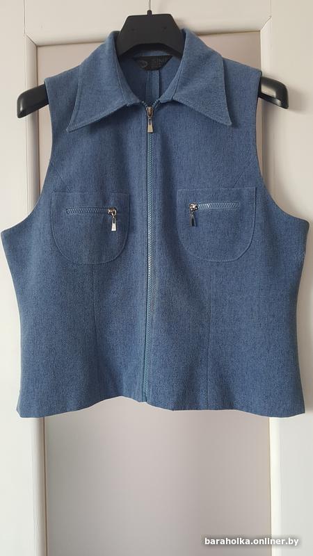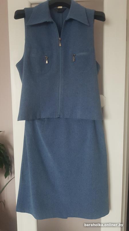 Костюм-комплект (юбка и жилет) размер 48. Юбка без пояса, с сзади шлица, на боках в поясе есть резинка, на подкладке. Юбка: длина юбки 56 см, талия 56 см, обхват бедер 100 см. Жилет: плечи37 см, длина по спинке 55 см, длина от подмышки 29 см, обхват грудиЖодино