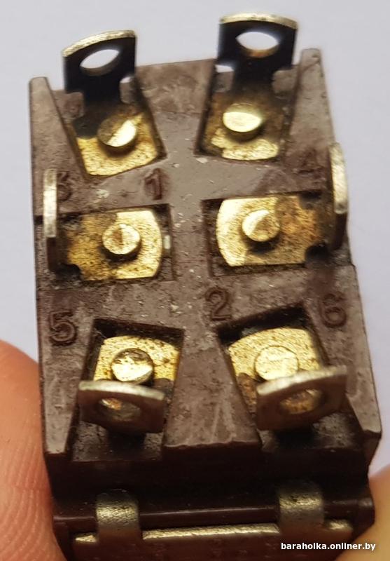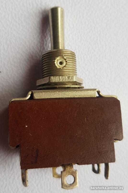 Это двухполюсный двухпозиционный переключатель (DPDT, ON-ON), с 6 контактами для коммутации цепей. Корпус из коричневого бакелита, контакты позолоченные, рычаг металлический (латунный или с покрытием);
