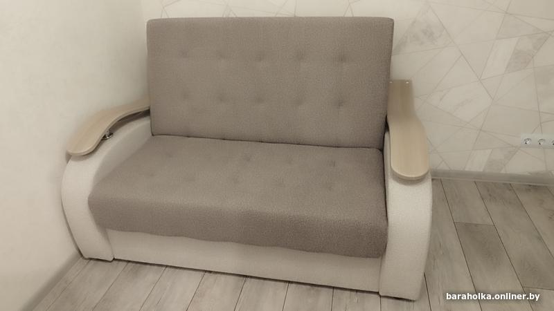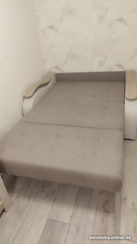 новый, в собранном варианте - 1100 (высота по спинке), 1550 (ширина), 1100 (длина), в разобранном - 50 (по высоте), 1550 (ширина), 2150 (длина). Спальное место - 2150х1200, очень удобное. Есть небольшая ниша для белья.