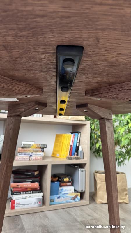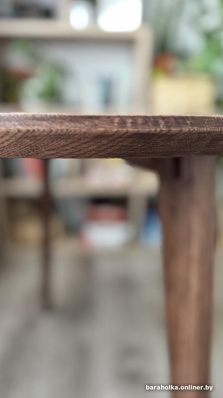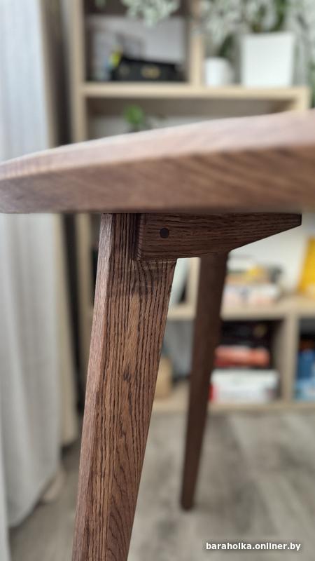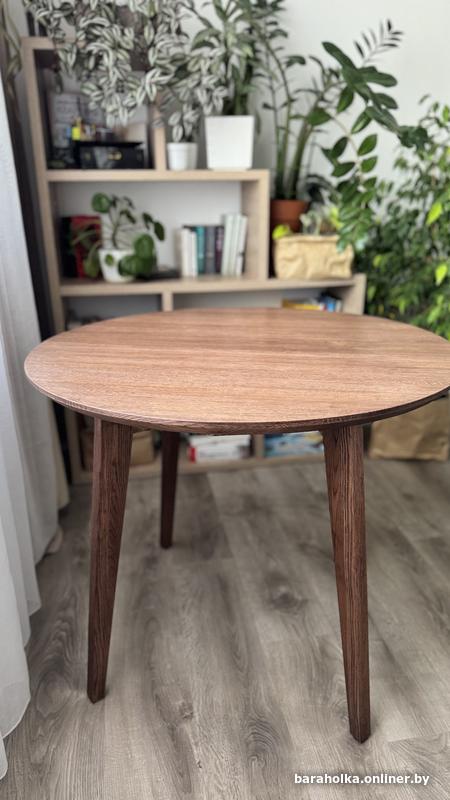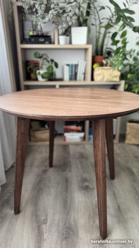 Обеденный стол полностью из массива дуба. Покрыт маслом . Благородный коричневый цвет без зелени и желтизны. Удобное расположение ножек. Диаметр 90 см, высота 75. Абсолютно новый. Можно разобрать, при необходимости.