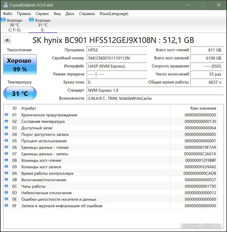 Примененные технологии: TRIM, S.M.A.R.T., NVMe, TLC.