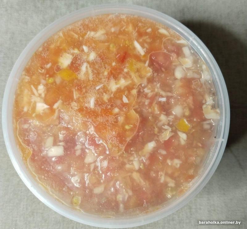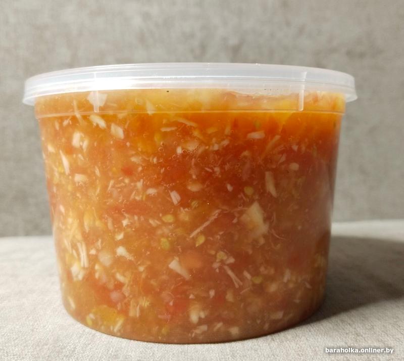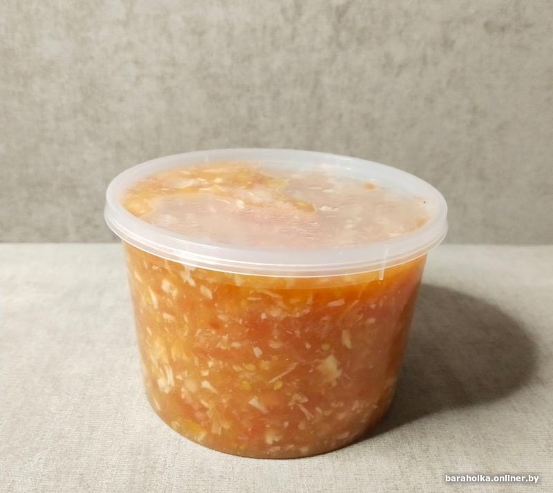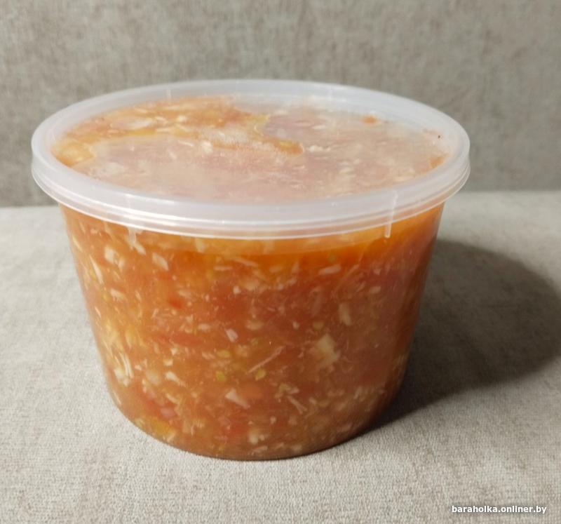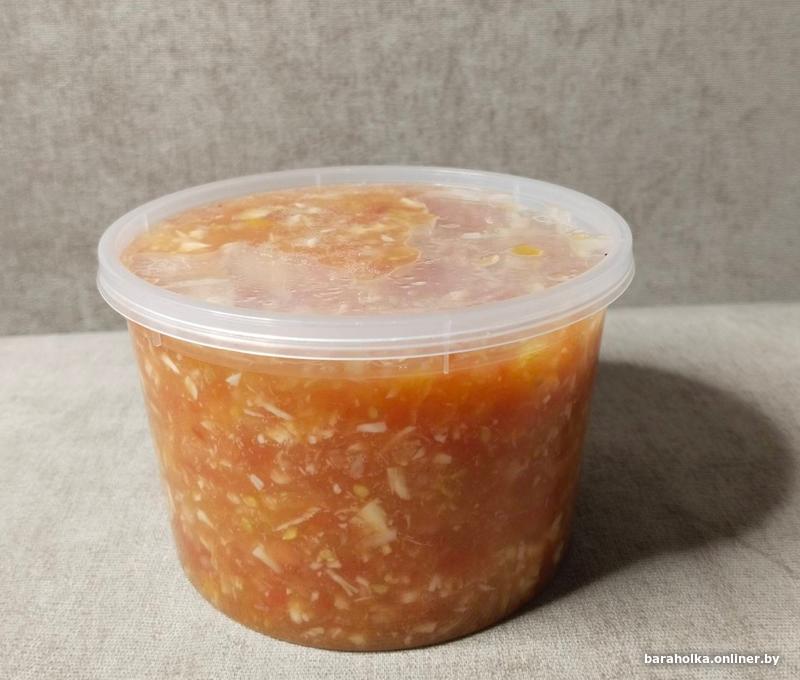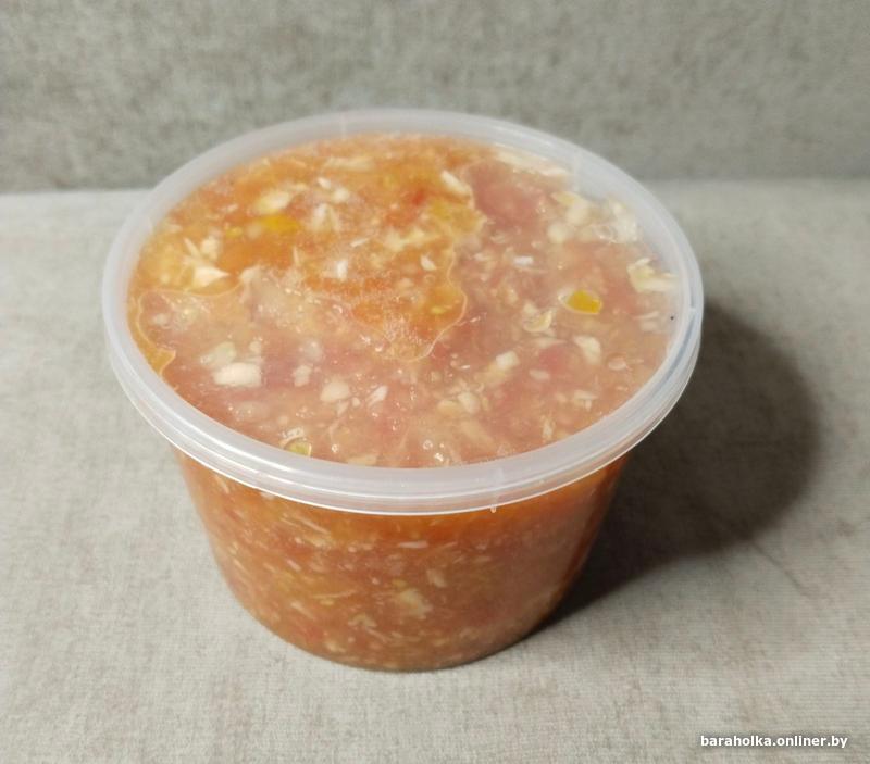 к основному блюду из пропущенных через мясорубку домашних помидоров, корня хрена, чеснока и соли. Баночка пластиковая, объемом 0,5 литра (500-505 гр). Самовывоз с площади Казинца.