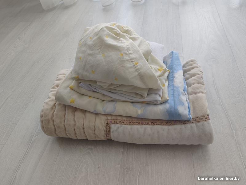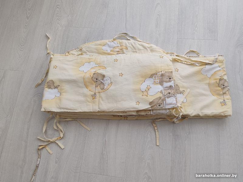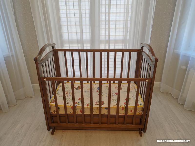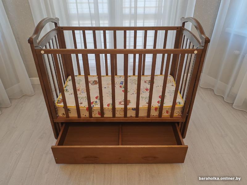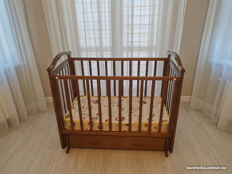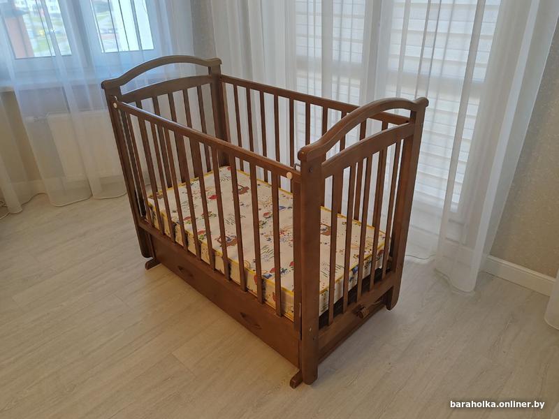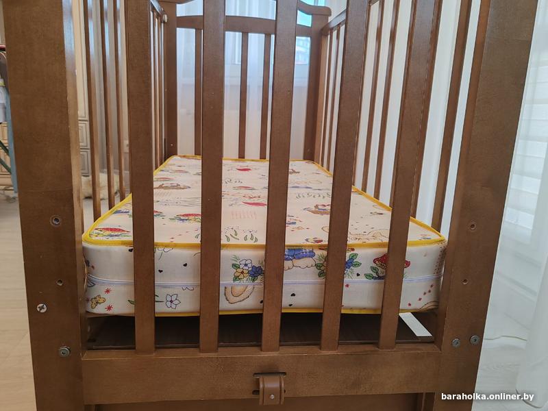 Кроватка из массива дерева в хорошем состоянии, все узлы исправны, деревянные детали без трещин. Маятниковый механизм с возможностью фиксации, опускающийся передний бортик, ящик для хранения вещей под кроваткой. Основание под матрас регулируется по высоте в трех положениях. Кроватка продается вместе с матрасом и мягкими бортиками, а также с комплектом белья и непромокаемой простынью на резинке. Все белье в отличном состоянии.