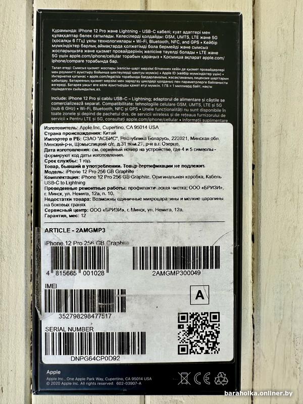 • 12 pro, графитовый, 84% батареи, хорошее состояние, все исправно и работает.Минск