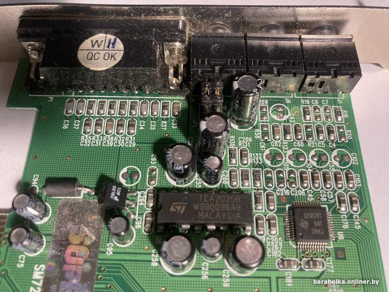 Помимо поддержки стандартной звуковой архитектуры AC’97, процессор имеет программно-аппаратный синтезатор стандарта XG Level 1 Внутренние соединители — аудио-входы от CD-ROMов различных производителей (Panasonic, Creative), аудио-входы Video и AUX. Процессор YAMAHA YMF724F-V, выпущен в конце 1999 г. Частота подключенного кварцевого резонатора 24,576 МГц. Кодек AvanceLogic ALC100, интегральный усилитель мощности UTC TEA2025, выход коммутируется джамперами. Внешние соединители (без цветового кодирования): 3,5 мм стерео линейный вход, 3,5 мм моно микрофон (конденсаторный), 3,5 мм стерео коммутируемый линейный выход или выход со встроенного усилителя, разъем для игрового манипулятора с контактами MIDI-порта.