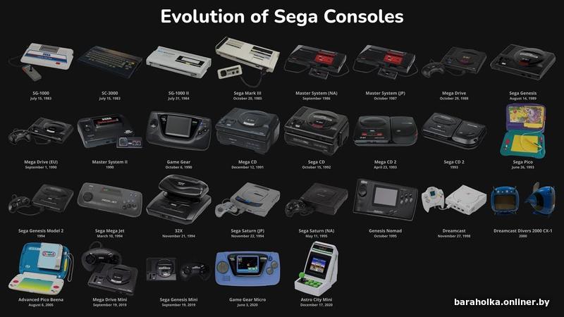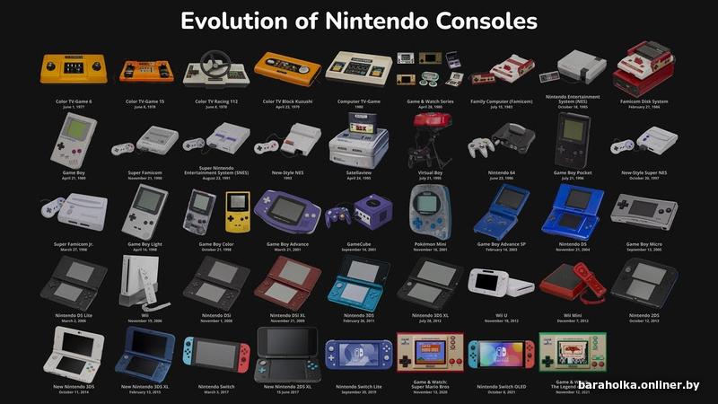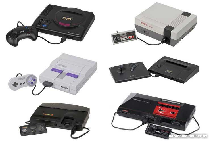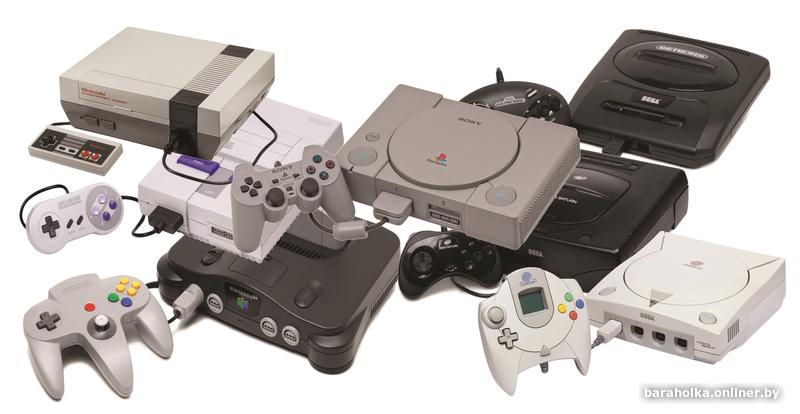 . Пример названий приставок Magnavox Odyssey, Pong Atari, Telstar Coleco, Ping-o-Tronic, Pong, APF TV Fun, Philips Odyssey, TV Scoreboard, Binatone TV Master Mk IV, Color TV Game 6, Color TV Game 15, Color TV Racing 112, Color TV Game Block Kuzushi, Computer TV Game, BSS 01, Fairchild Channel F / Video Entertainment System (VES), Channel F System II, RCA Studio II, Atari 2600 / Atari Video Computer System (VCS) / Sears Video Arcade, Atari 2600 Jr., Atari 2800, Coleco Gemini, Bally Astrocade, Interton VC 4000, Magnavox Odyssey², APF Imagination Machine, Intellivision, PlayCable, Bandai Super Vision 8000, Intellivision II, CreatiVision, Epoch Cassette Vision, Super Cassette Vision, Emerson Arcadia 2001, Atari 5200, Atari 5100, ColecoVision, Entex Adventure Vision, Vectrex, RDI Halcyon, PV-1000, Commodore 64GS, Amstrad GX4000, Atari 7800, Atari XEGS, Sega SG-1000, Sega SG-1000 II, Sega Master System, Sega Mark III, Nintendo Entertainment System (NES) / Famicom, C1 NES TV / Sharp Nintendo Television, NES-101 / AV Famicom, Famicom Disk System, Zemmix, Action Max, Sega Mega Drive / Sega Genesis, Sega Power Base Converter, Sega Mega Drive II, Sega Genesis II, Sega Mega Drive III, Sega Genesis 3, Sega CDX / Multi-Mega, Mega-CD/Sega CD, Sega 32X, JVC X’eye / The Wondermega, Sega Pico, PC Engine / TurboGrafx-16, TurboGrafx-CD, SuperGrafx, Konix Multisystem, Neo-Geo, Neo-Geo CD, Neo-Geo CDZ, Commodore CDTV, Tandy Memorex VTandy Video Information SystemIS, Super Nintendo Entertainment System (SNES) / Super Famicom, SF-1 SNES TV, SNES 2 / Super Famicom Jr., SNES-CD, Satellaview, FM Towns Marty, CD-i, TurboDuo / PC Engine Duo, Pioneer LaserActive, Super A'Can, Virtual Boy, Apple Pippin, PC-FX, Atari Panther, Atari Jaguar, Atari Jaguar CD, Atari Jaguar II, PlayStation, Net Yaroze, Sega Saturn, Panasonic 3DO, Amiga CD32, Casio Loopy, Playdia, Nintendo 64, Nintendo 64DD, Sega Neptune, PSone, ApeXtreme, Atari Flashback, Dreamcast, L600, Nintendo GameCube, Nintendo Gameboy Player, Nuon, iQue Player, Panasonic Q/Q Game Boy Player, PlayStation 2, PlayStation 2 Slimline, PSX (DVR), V.Smile, XaviXPort, Xbox, Atari Flashback 2, PlayStation Portable, Nintendo DS, Atari Flashback 3, Atari Flashback 4, EVO Smart Console, Retro Duo, Game Wave, Mattel HyperScan, PlayStation 3, PlayStation 3 Slim, PlayStation 3 Super Slim, Nintendo Wii, Xbox 360, Xbox 360 Slim, Sega Firecore, Zeebo, Zone, Sega Zone, Wii U, PlayStation 4, Nintendo 3DS, PlayStation Vita, GameStick[4], OUYA, MOJO, GamePop, Xbox One, Xbox One S, PlayStation 4 Slim, PlayStation 4 Pro, Xbox One X, Nintendo Switch, Nintendo Switch Lite, Nintendo Switch OLED