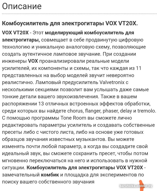 • Продам Vox VT20X.Состояние нового, документы, упаковка, покупался в Германии.Новополоцк