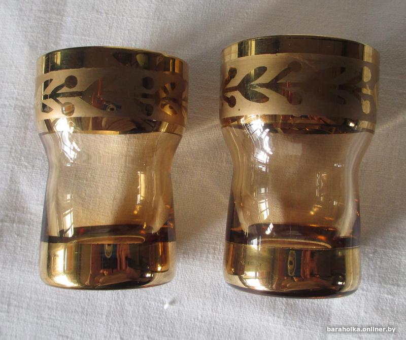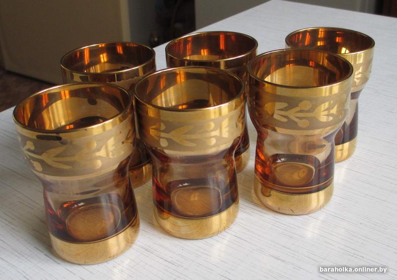 1. Рюмки из темно-медового стекла с позолотой времен СССР, удобные и красивые. В прекрасной сохранности. 6штук. Высота 7см. Объем до краев 70мл. Цена за набор 35руб.
