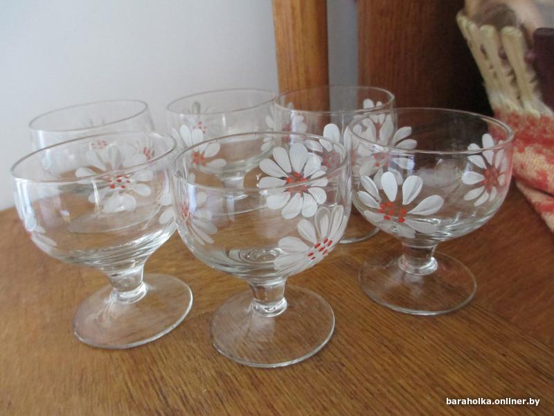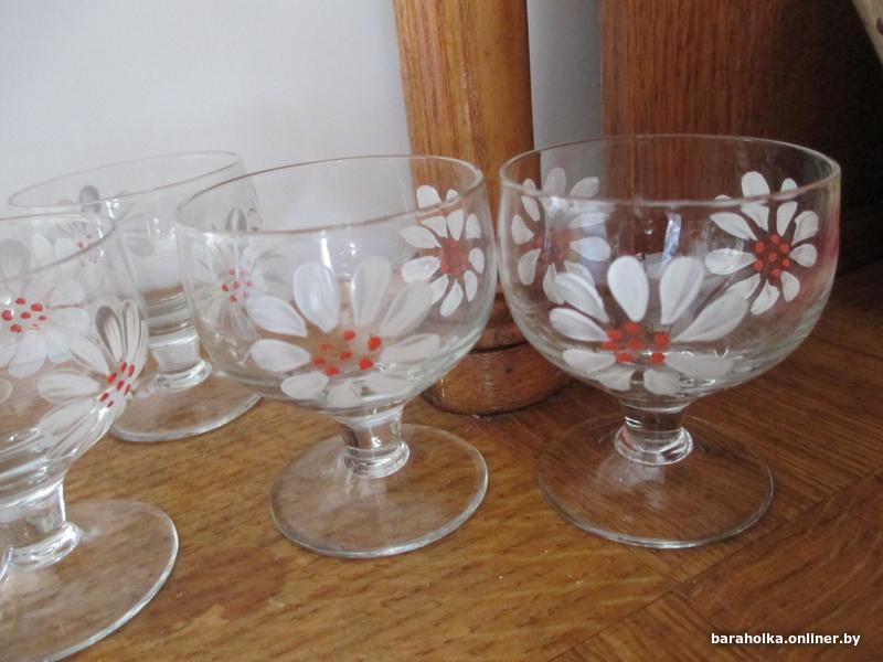 2. Рюмочки с цветочками из тонкого стекла. Ручная роспись. 6 штук в идеальном состоянии. Объем до краев 50мл, высота 6см, диаметр верха 5см. Цена за набор 18руб.