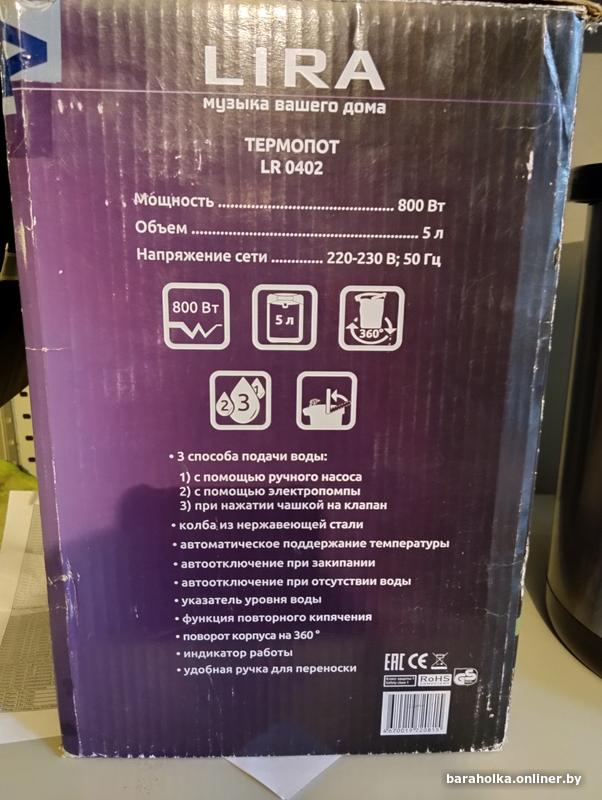 Продается термопот LIRA LR 0402,объем 5 л, мощность 800 Вт.Находится в г.Витебске,возможна пересылка или доставка по договоренности.