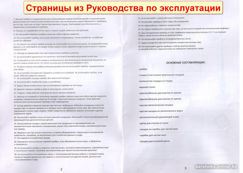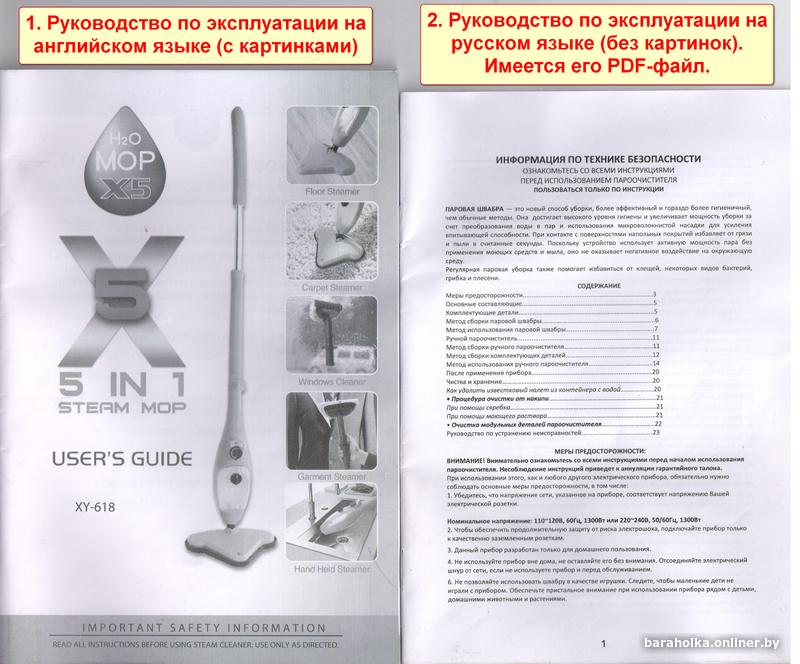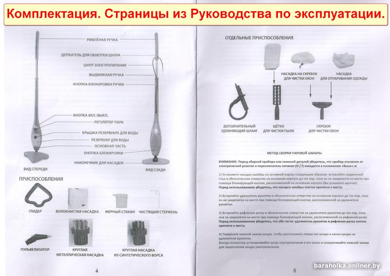 Имеется (была приложена при покупке) инструкция по эксплуатации на английском и русском языках. Английская - с картинками, русская – её перевод без картинок. Применяя обе инструкции – всё понятно со сборкой швабры, режимами её работы, использованием комплектации и пр. Русскую инструкцию отсканировал (файл PDF), могу прислать для предварительного ознакомления.
