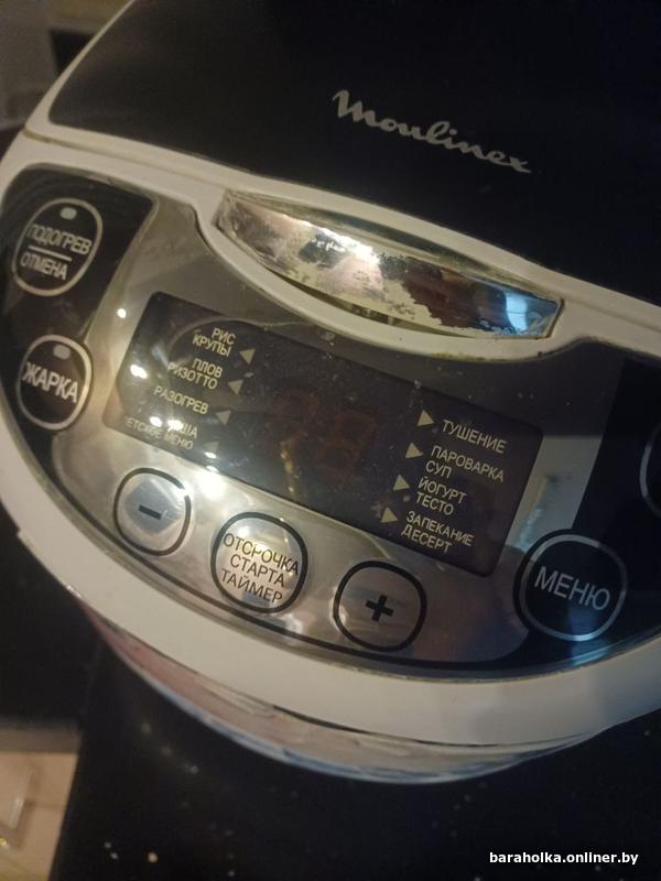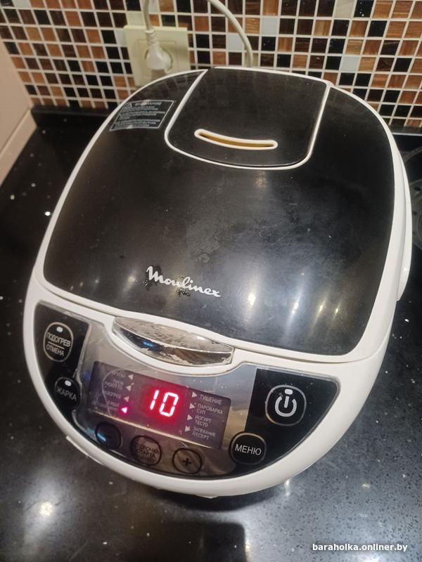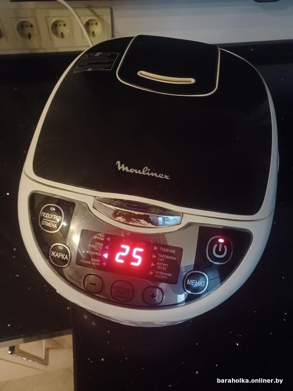 Мультиварка «Мулинекс» хорошая, многофункциональная мультиварка. Много функций: Рис/крупы, Плов/Ризотто, Разогрев, Молочная каша, Тушение, Пароварка/суп, Йогурт, Выпечка, Жарка. Когда мультиварка включается в розетку, раздается сигнал и на панели загораются индикаторы. После выбора меню и начала работы, все символы на дисплее, погаснут, кроме выбранного.