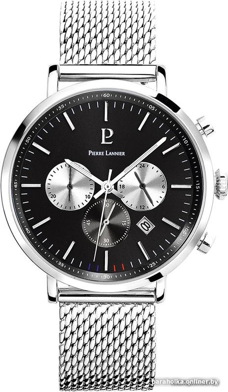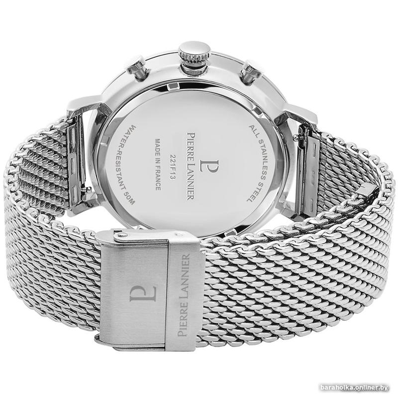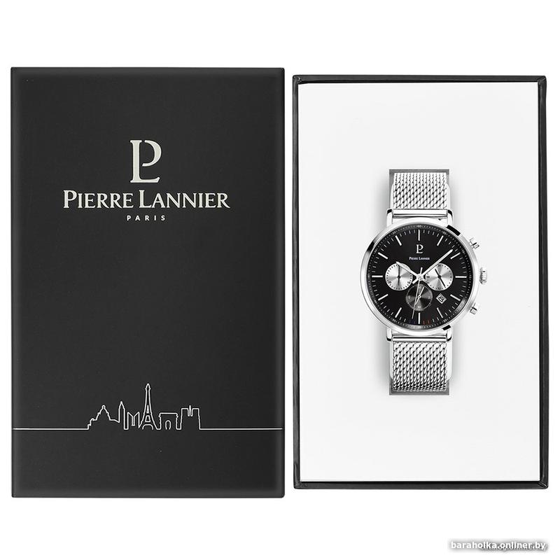 Новые мужские часы наручные PIERRE LANNIER 221F131, механизм кварцевый, корпус: нержавеющая сталь, 43 мм, минеральное стекло, водозащита 50 м (5 АТМ), браслет миланского плетения, длина браслета: 110x75 мм, ширина браслета: 20 мм.