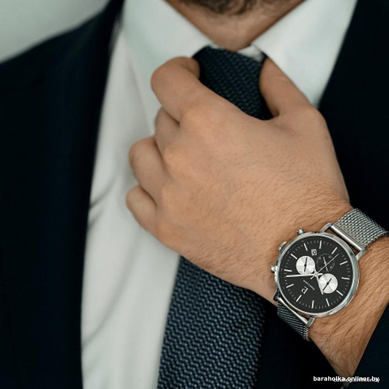 Мужской кварцевый хронограф. Центральные часовая и минутная стрелки, секундная стрелка вынесена на малый циферблат. Апертура даты между 4 и 5 часами. 12/24х часовой формат времени. Секундомер. Черный циферблат. Круглый корпус выполнен из нержавеющей стали. Диаметр корпуса составляет 43 мм, толщина 10,6 мм. Стальной браслет шириной 20 мм выполнен в технике миланского плетения, раскладная застежка. Прочное минеральное стекло устойчивое к мелким механическим повреждениям. Водостойкость WR 50 (мытье рук, дождь).