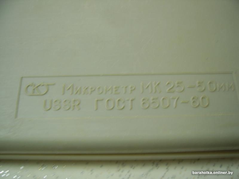 Микрометр гладкий тип МК 0-25мм: USSR, завод «Калибр» (г.Москва), по ГОСТ 6507-60. Для наружных измерений линейных размеров, считывание вычисляемого размера - по двум шкалам: по горизонтальной шкале стебля считывается значение с точностью 0,5мм, а по вертикальной шкале барабана – с точностью 0,01мм, реальный размер получают сложением этих 2-х значений; предел измерений 0-25мм, цена деления (точность) 0,01мм, класс точности – первый, стопор (зажим) микрометрического винта для фиксации полученного значения, с трещоткой (фрикционом) для ограничения измерительного усилия.