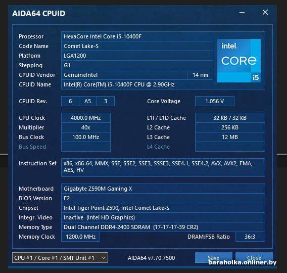 - Процессор: Intel Core i5-10400F / 6 ядер, 12 потоков, частота 4.3/2.9 ГГц