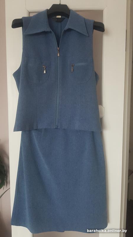 Костюм-комплект (юбка и жилет) размер 48. Юбка без пояса, с сзади шлица, на боках в поясе есть резинка, на подкладке. Юбка: длина юбки 56 см, талия 56 см, обхват бедер 100 см. Жилет: плечи37 см, длина по спинке 55 см, длина от подмышки 29 см, обхват грудиЖодино