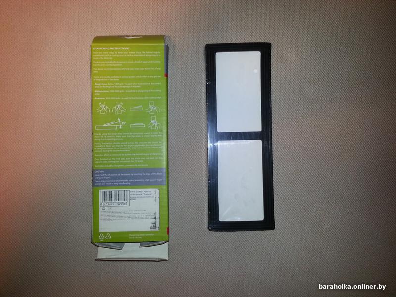 Новый, не распакованный. Покупался в качестве подарка. Зернистость - 2000 грит, длина - 190 мм, ширина - 70 мм, высота - 24 мм, вес - 294 гр. Силиконовая подставка в комплекте.