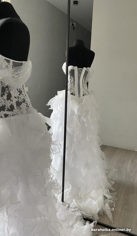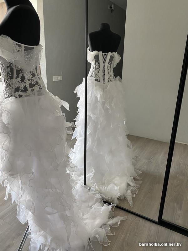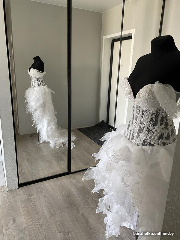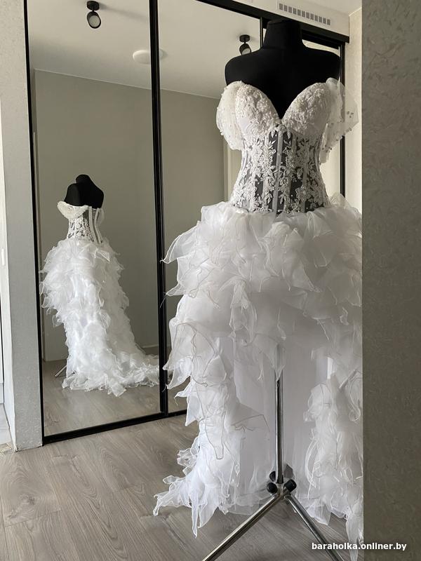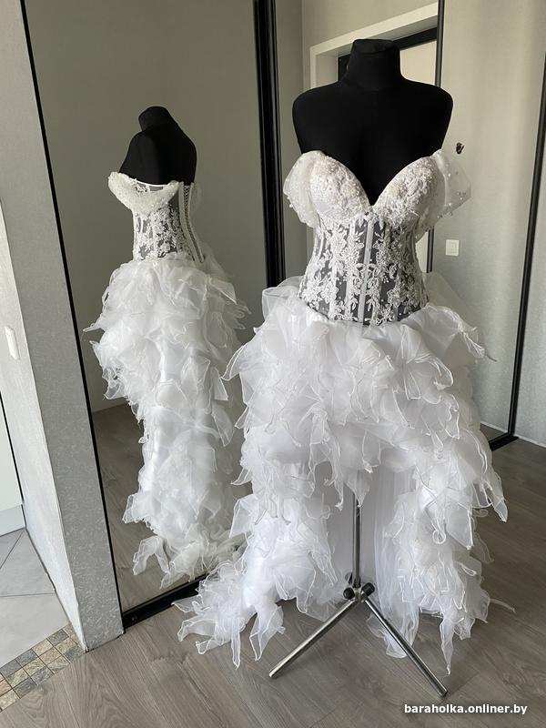 Свадебное платье новое, р. 42-44, регулируется шнуровкой по спинке. Корсет расшит кружевом , жемчужинками и стразами. Цвет белый.Шлейки сьемные с жемчужинками. Юбка спереди короткая и со шлейфом. Юбка выполнена в уникальной технике, создается объем и воздушность. Возможно изготовление фаты, так же возможна подгонка. Тел +375296992411