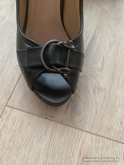 Модельные черные туфли с открытым носиком на высоком каблуке из искусственной кожи. Немного б/у. Состояние отличное. Размер 36. При необходимости могу выслать почтой.