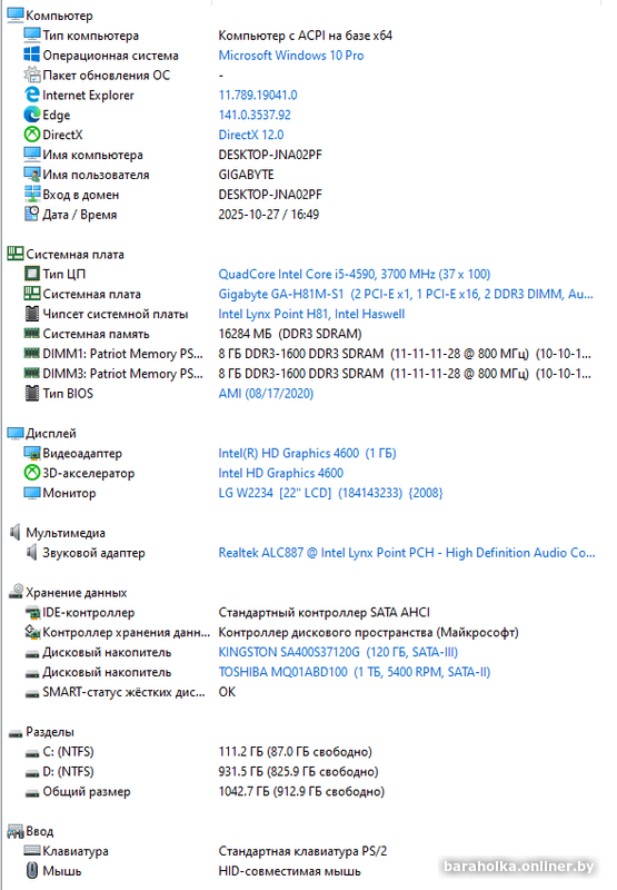 • оперативная память DDR3 16 ГБ 1600 MHz
