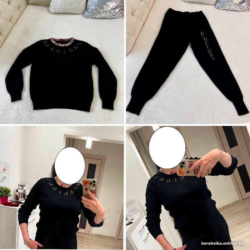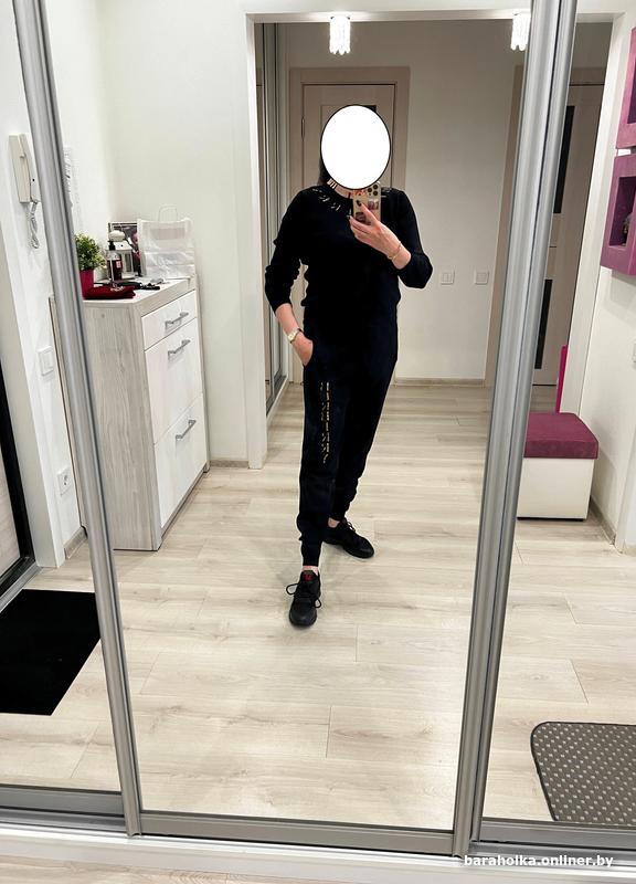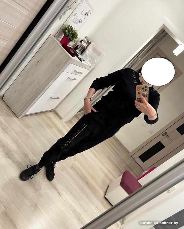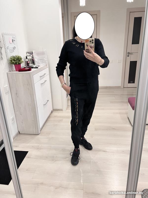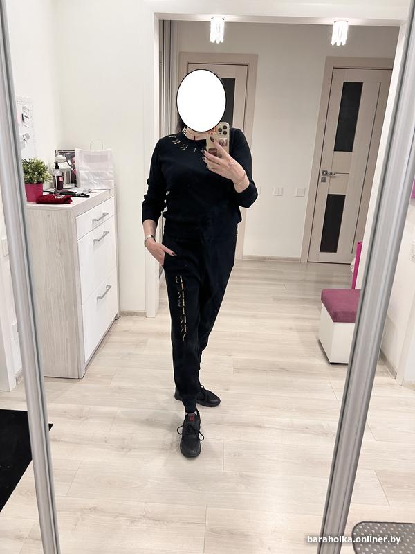 Костюм трикотажный, размер единый примерно 42-46, на фото одет на 46 размер, рост 167. Покупался в шоуруме г. Минска, брюки одевались раза 2, свитшот раз 7-8, плотный трикотаж, состояние практически нового, не скатывается, цвет остается черный после стирки.